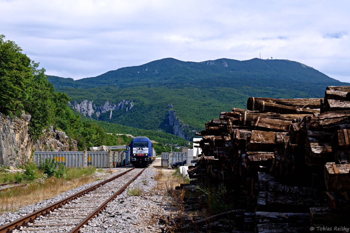 - Hier erneut die Fahrt vom Bf Ucka nach Lupoglav mit dem Bergmassiv Ucka im Hintergrund.