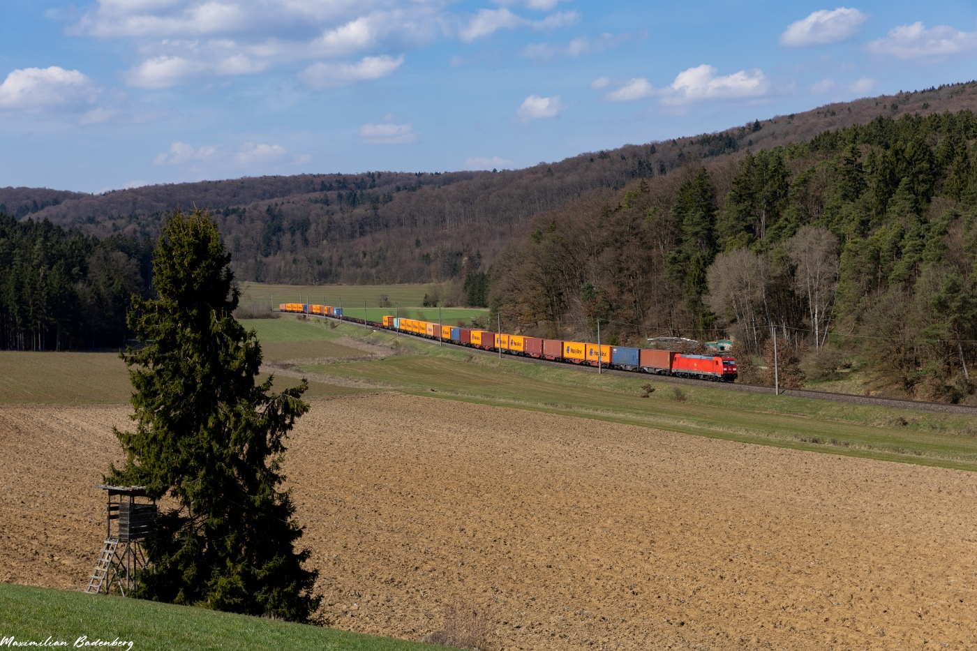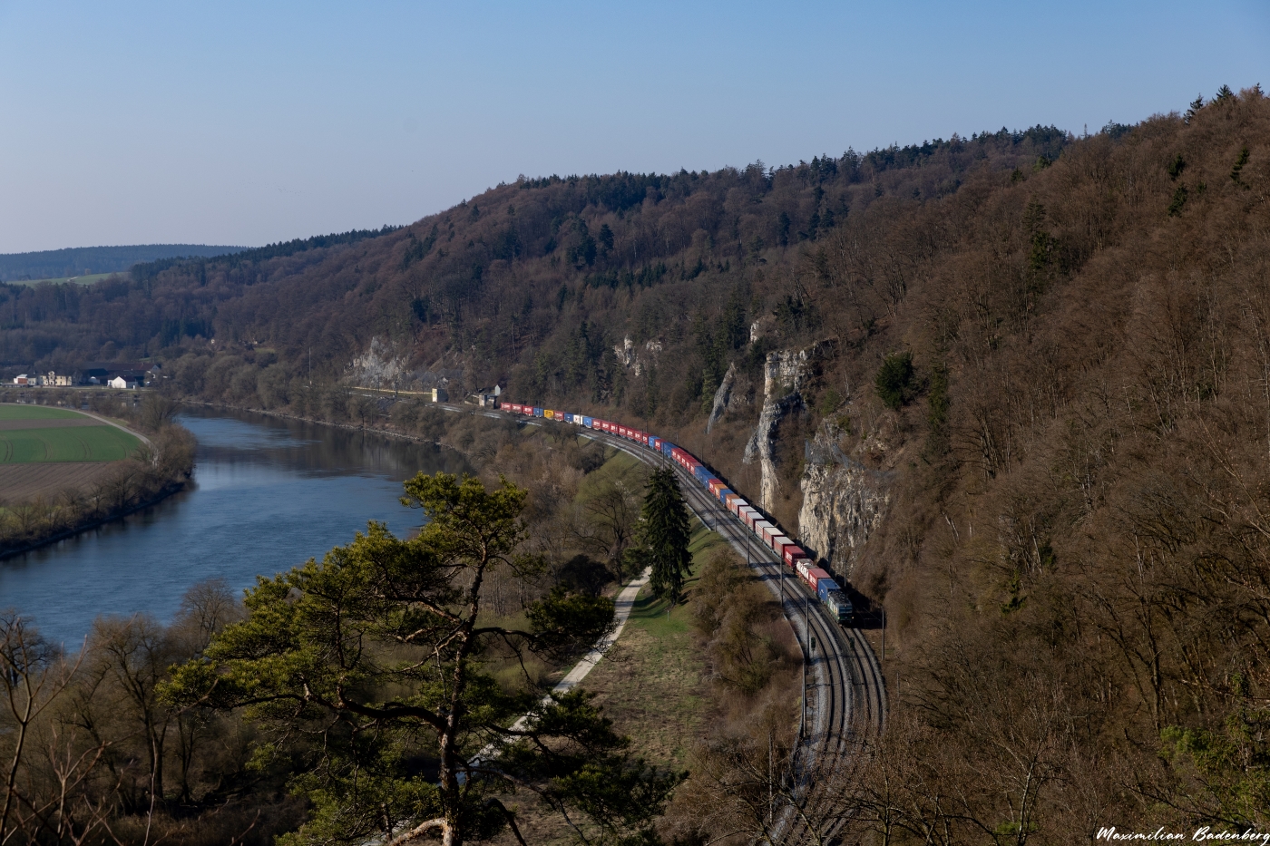 Von der mächtigen Donau wechseln wir an den unscheinbaren „Hopfenbach“. Dieser hat hier vor vielen Jahren ein weiters Tal geschaffen, welches sich ein Stück weit parallel zur Donau entlang zieht. Dieser Blick bei Thaldorf-Weltenburg dürfte wieder etwas bekannter sein. Für mich der schönste Güterzug an diesem Tag, da endlich mal kein Vectron vorgespannt war 😛