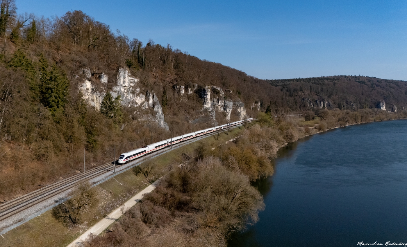 Der erste fotogene ICE – 1228 nach Köln Hbf – kam dann gegen 11.00 Uhr durch das Donautal geschossen. Mit der Drohne war ein höherer Standpunkt mit besserem Blick auf die Donau umsetzbar.