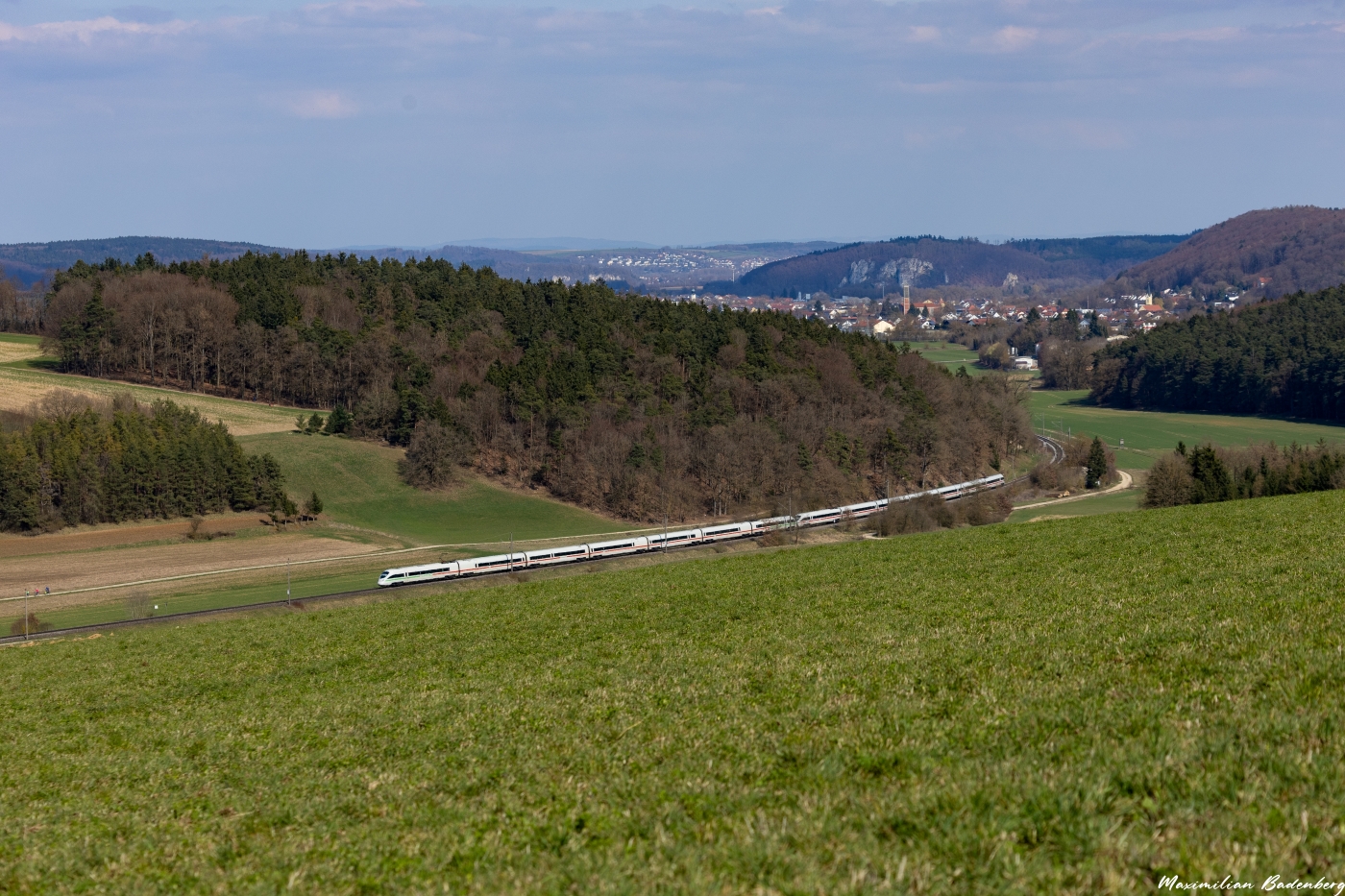 Vom Hopfenbachtal aus kann man aber auch ins Donautal blicken. Elegant neigte sich der ICE 1224 um die Kurve, während über Saal (Donau) und Bad Abbach die ersten großen Wolken reinzogen.