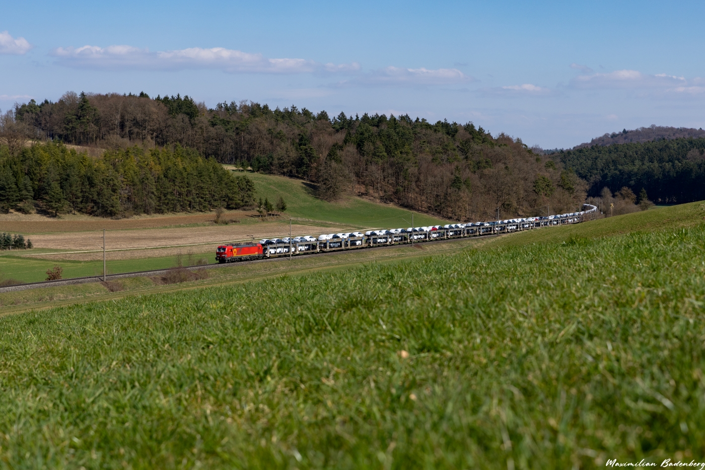 Wir befinden uns immer noch am Hopfenbach. Ein roter Beacon-Vectron im Auftrag für ECCORail war mit einem vollem Autozug auf dem Weg Richtung Ingolstadt. Dafür legte sich der Fotograf sogar ins Gras.