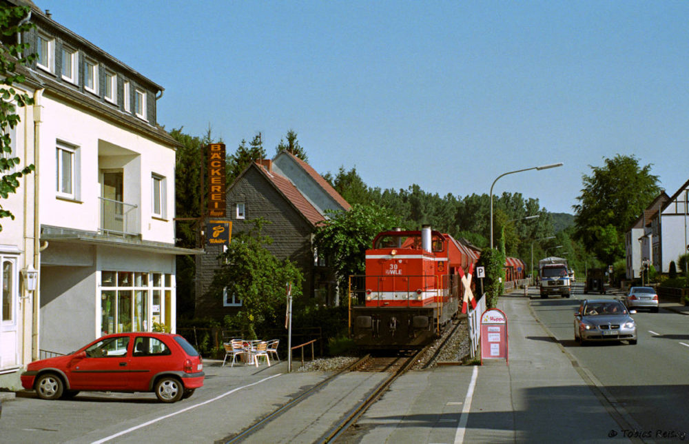 - Immer wieder ein dankbares Motiv für Bahn & Straße ist die Ortsdurchfahrt in Belecke an der WLE. Am 06.08.2007 passierte Lok 30 die Bäckerei Hoppe und einen davor geparkten roten Opel Corsa B.