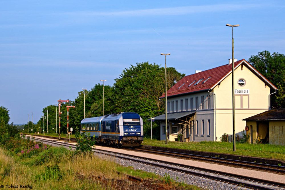 - Gleich am ersten Verkehrstag des kuriosen Umleiterleerzuges stand ich an der Strecke: Nur einen Wagen hatte 223 081 am Haken, als sie kurz vor Sonnenuntergang durch Freihöls brauste.