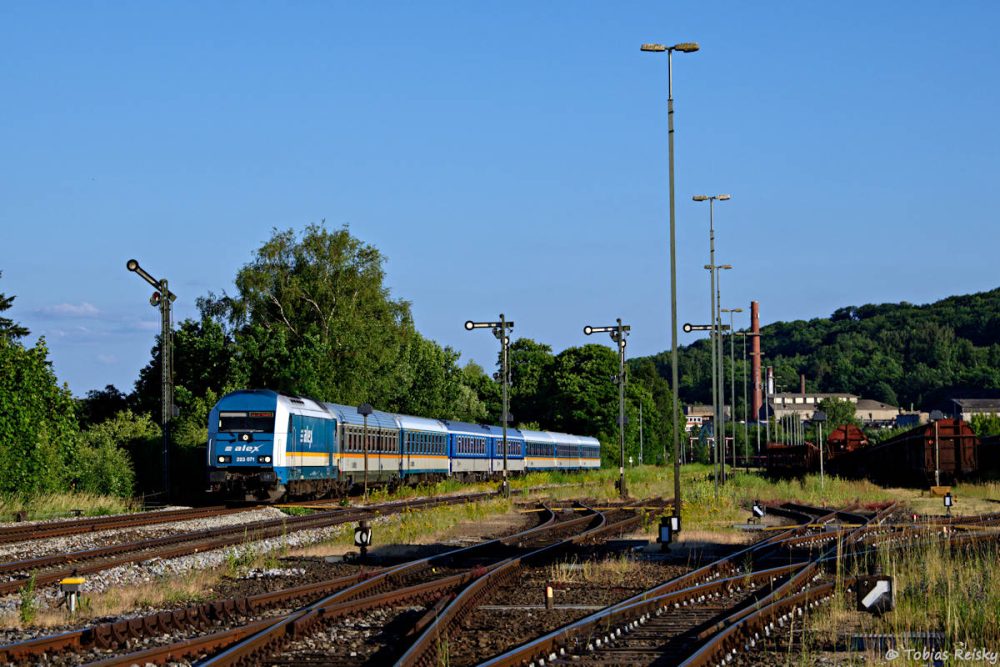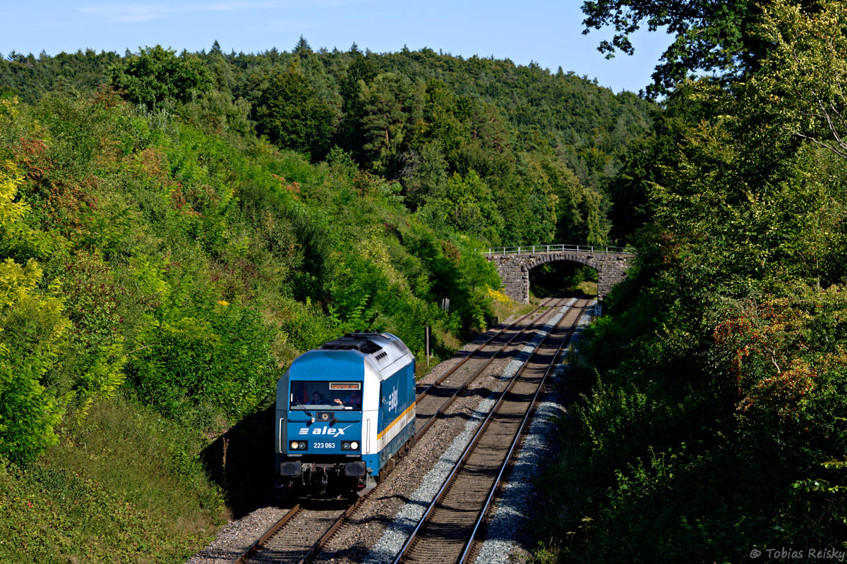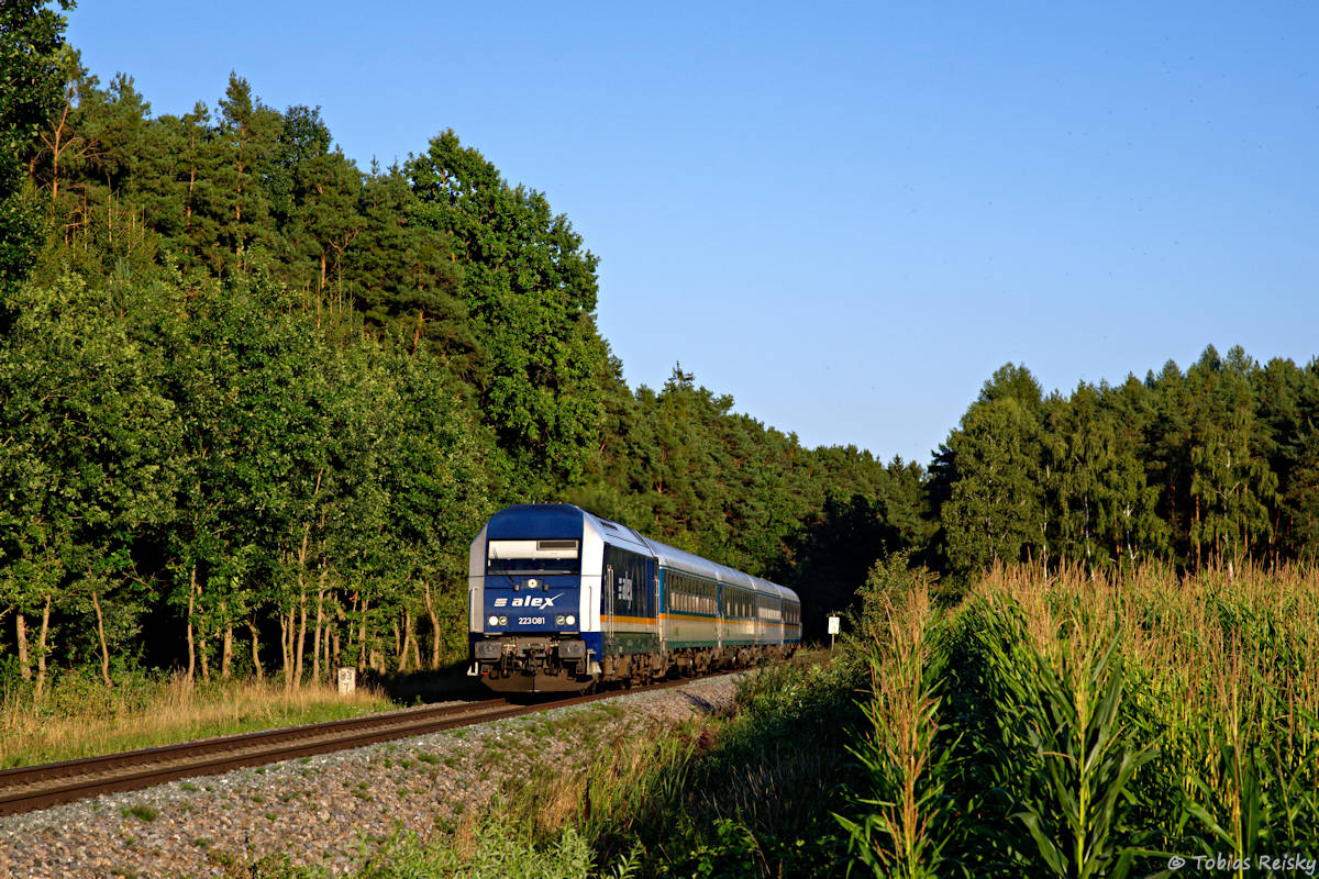 - Mein letztes Umleiterbild könnte bis auf die Lok auch vor 2012 entstanden sein, als der ALEX noch planmäßig nach Nürnberg fuhr. Mit vier Wagen hatte 223 081 bei Freihöls eine klassische Garnitur zu befördern.