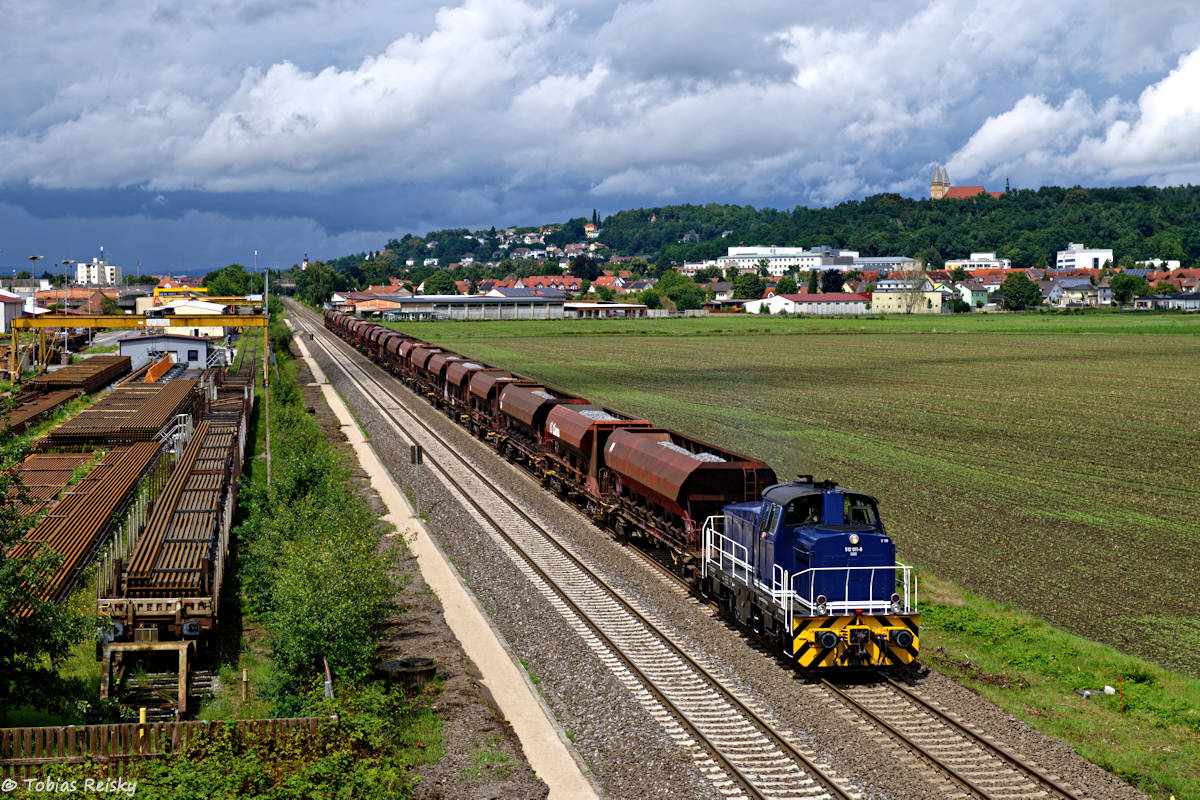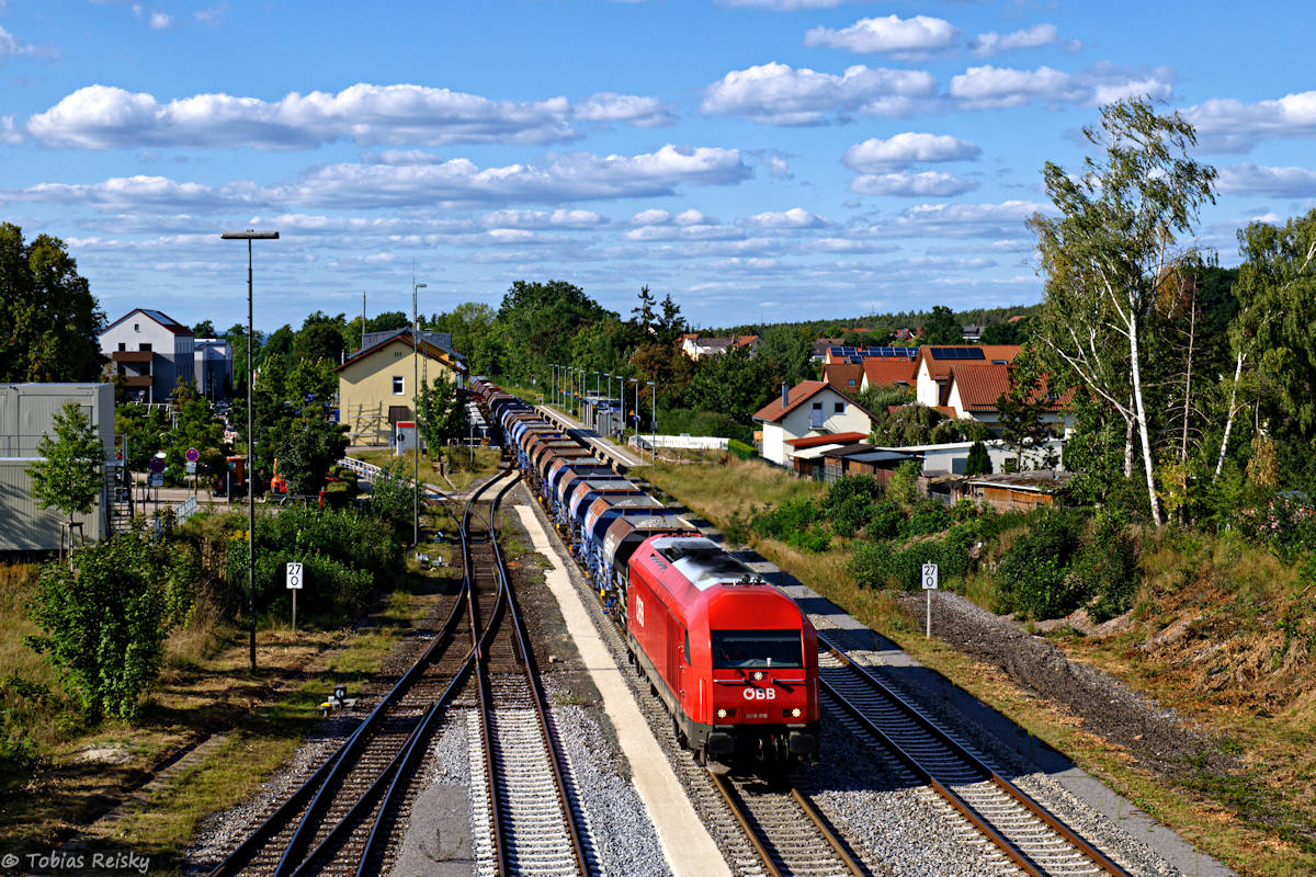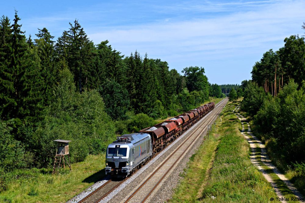 - Wenden wir uns kurz den eigentlichen Bauzügen zu: 248 058 von RheinCargo brachte am 20.07. einen Schotterzug von Schwandorf nach Regensburg – im Baugleis mit 20km/h eine langwierige Angelegenheit.