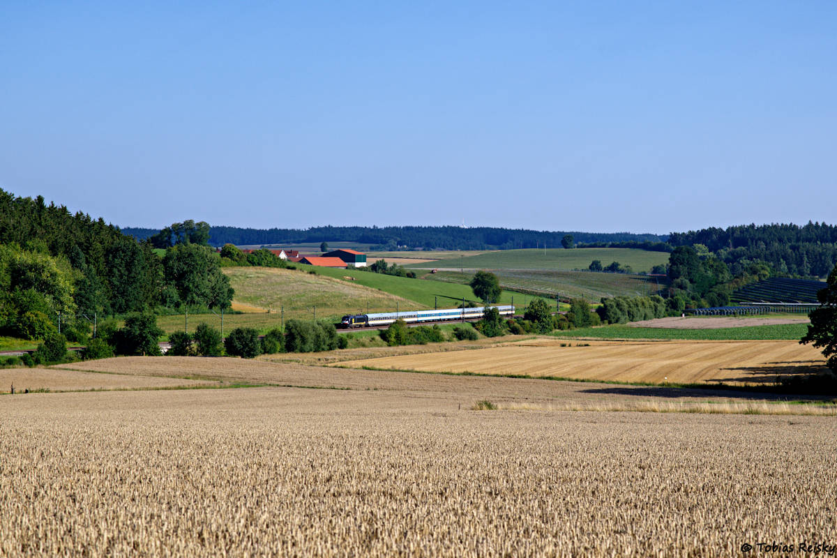 - Zwischen Regensburg und München fuhr der ALEX natürlich – jedoch mit ungewöhnlichen Zuggarnituren, zum Teil ohne CD-Wagen – hier bei Ascholtshausen.