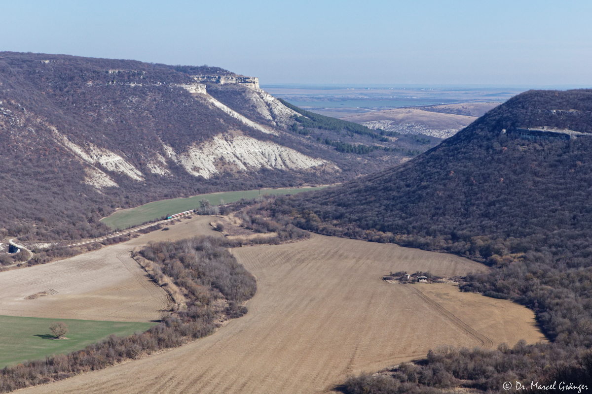 Nachdem ich einige Tage zuvor über Luftbilder und Führerstandsmitfahrten ausgespäht hatte, dass an der Strecke von Prowadija nach Kaspitschan einige nette Blicke möglich sein sollten, verlagerte ich mich mal dorthin. Der Fußmarsch zum Motiv stellte sich dann doch weiter heraus als ursprünglich gedacht (gut 30 Minuten vom Auto ans Motiv). Gelohnt hatte es sich allemal als dann unten im Tal ein Personenzug durchs Bild rollte. Links und rechts in den Bergen erkennt man in früheren Zeiten als Klöster genutzte Höhlen, die es in dieser Gegend sehr zahlreich gibt.