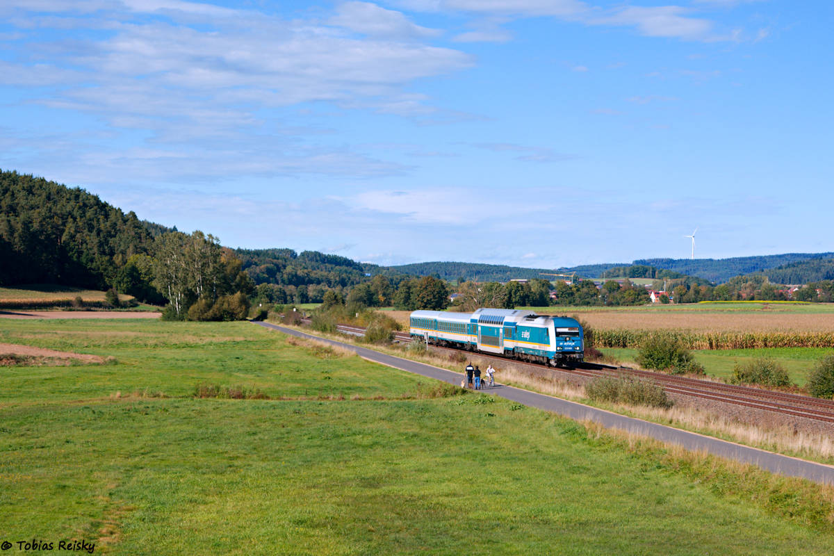 - Nördlich von Neustadt wartete ich dann eigentlich auf den Sandzug mit Maxima (der auch kam) – gezeigt werden soll hier aber der auch nicht planmäßig fahrende 612 als Umleiter wegen Sperrung der Pegnitzstrecke.