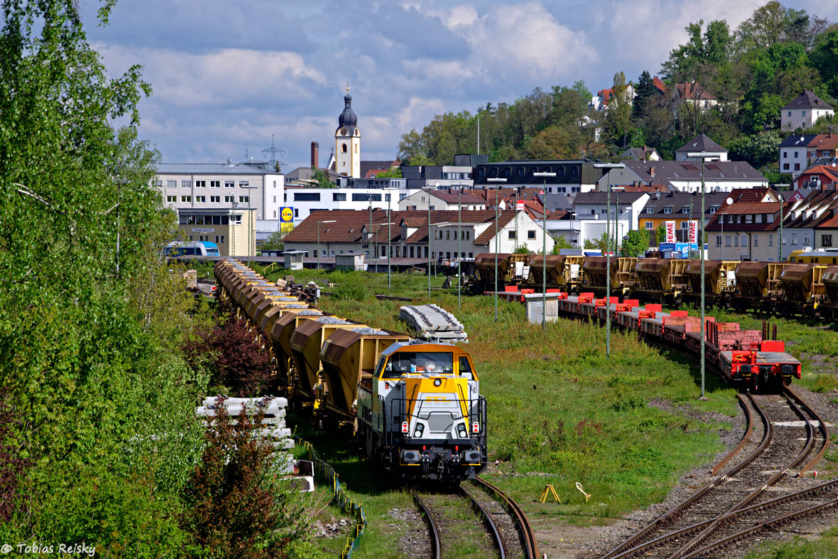 - Auch in den Bereich der Anstaltsgleise und der Baugrube bietet die neue Fußgängerbrücke in Schwandorf ungewöhnliche Perspektiven. Hier eine SGL Gravita beim Warten auf neue Aufgaben.