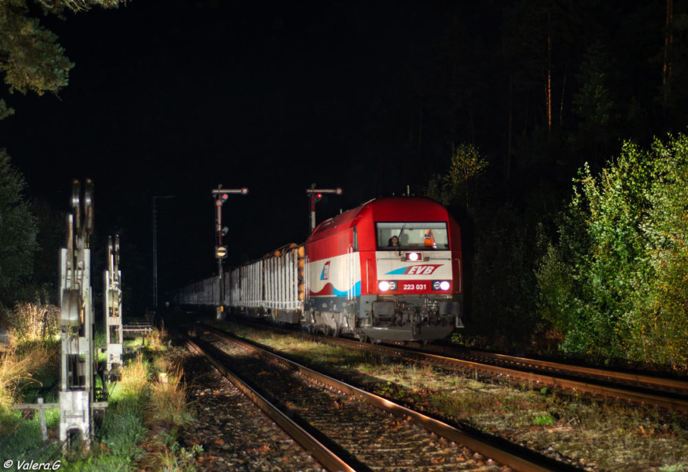 Mein erstes vernünftiges Blitzbild entstand in Parkstein-Hütten mit einem Holzzug, die von der EVB 223 bespannt war. Natürlich wurde der Fdl. über diese Aktion informiert, genauso wie der Kollege auf der Lok.