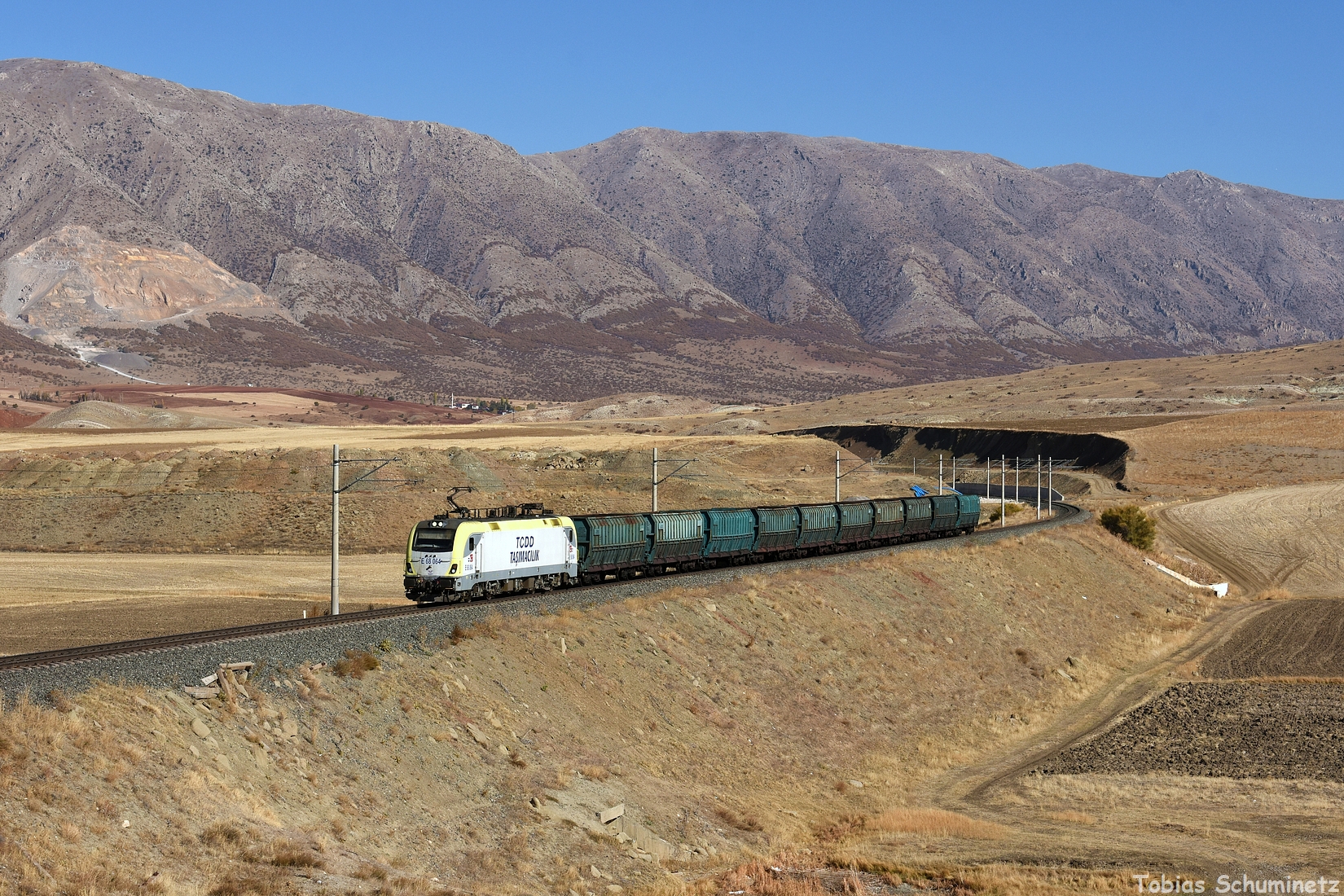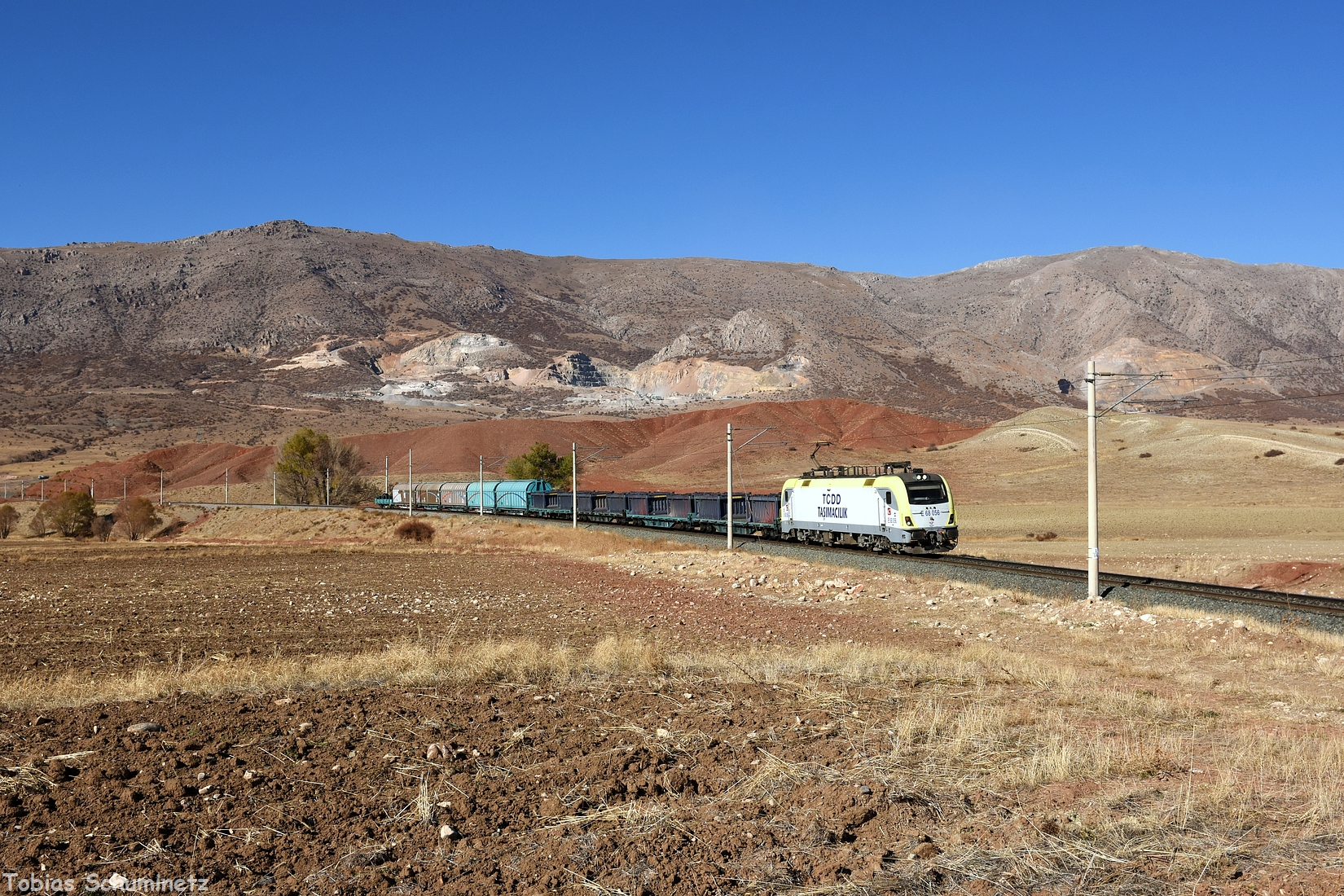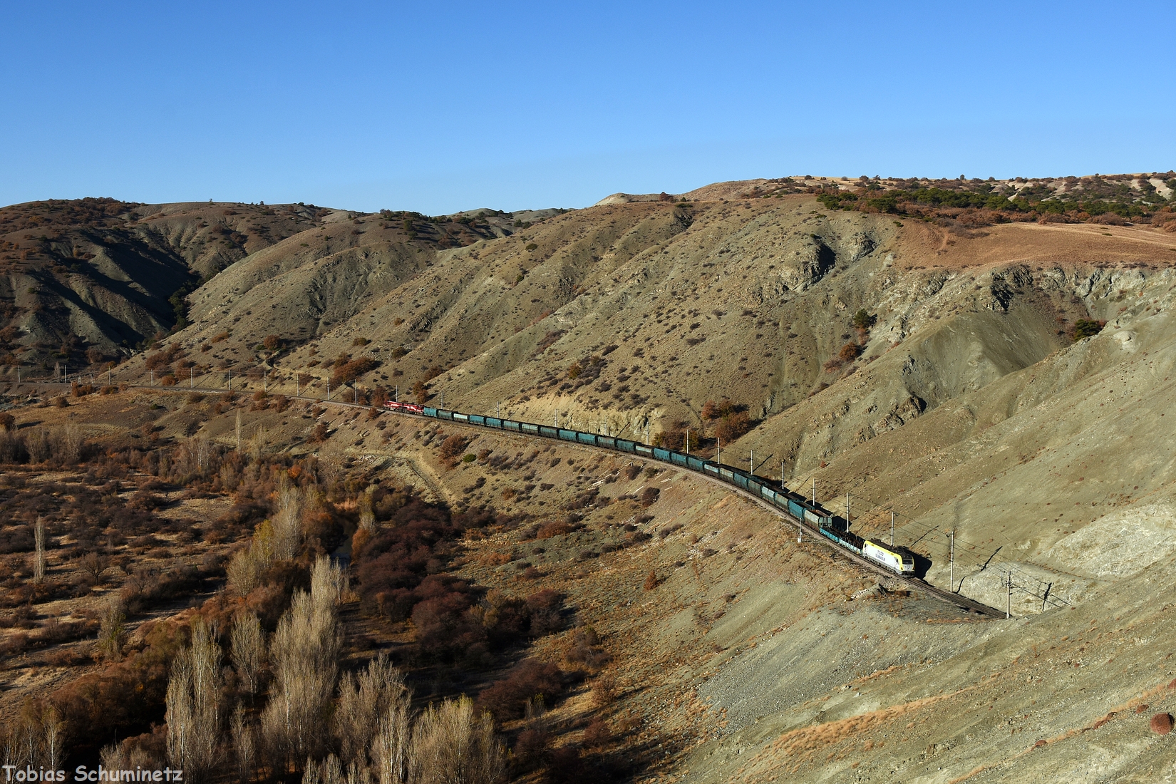 in en zwei großen Schleifen unterhalb von Gürpinar konnte die von Hyundai Rotem entwickelte und bei Tülomsas gebaute E68 064 mit einem kurzen Erzzug bergaufwärts beobachtet werden.