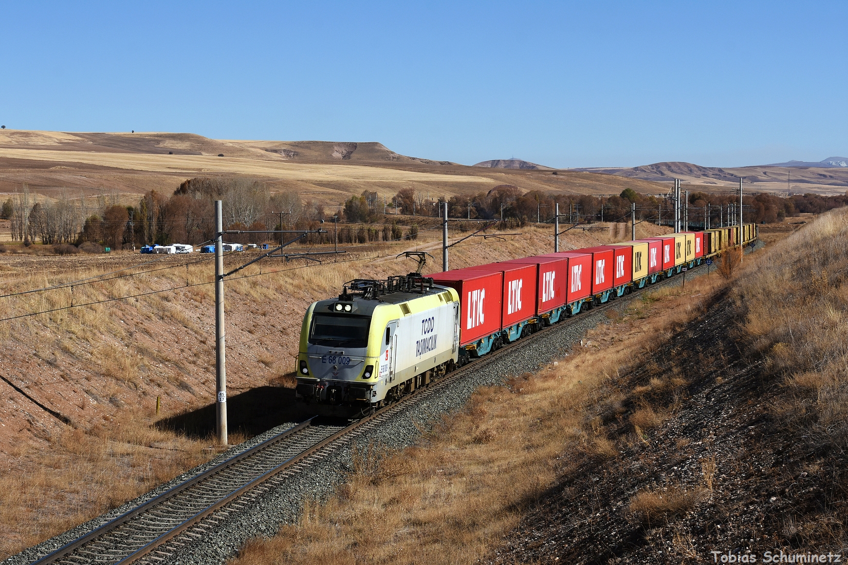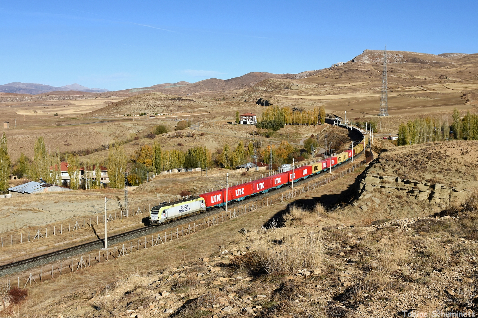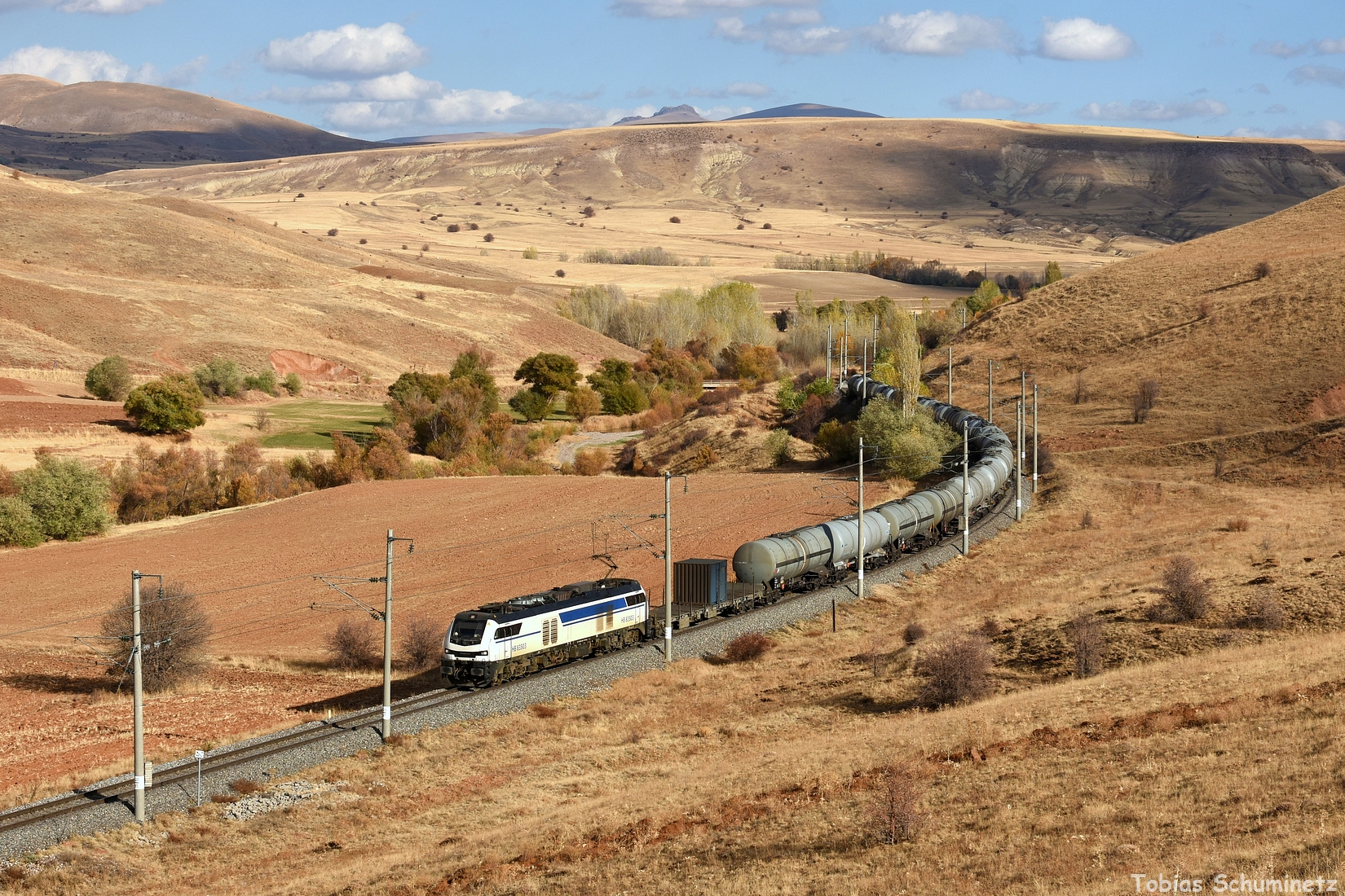 in en zwei großen Schleifen unterhalb von Gürpinar konnte die von Hyundai Rotem entwickelte und bei Tülomsas gebaute E68 064 mit einem kurzen Erzzug bergaufwärts beobachtet werden.