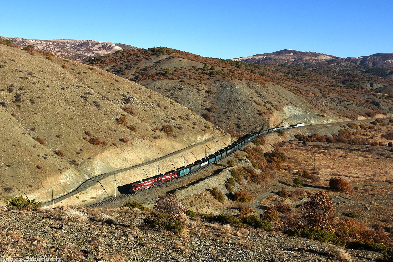 Da die Innenkurve in der unteren Schleife bei Gürpinar beim letzten Mal nicht geklappt hat, sollte es diesmal nochmal wiederholt werden. Innerhalb kürzester Zeit kamen zwei Züge hintereinander. Der erste war E68056 mit einem gemischten Zug in Richtung Malatya.