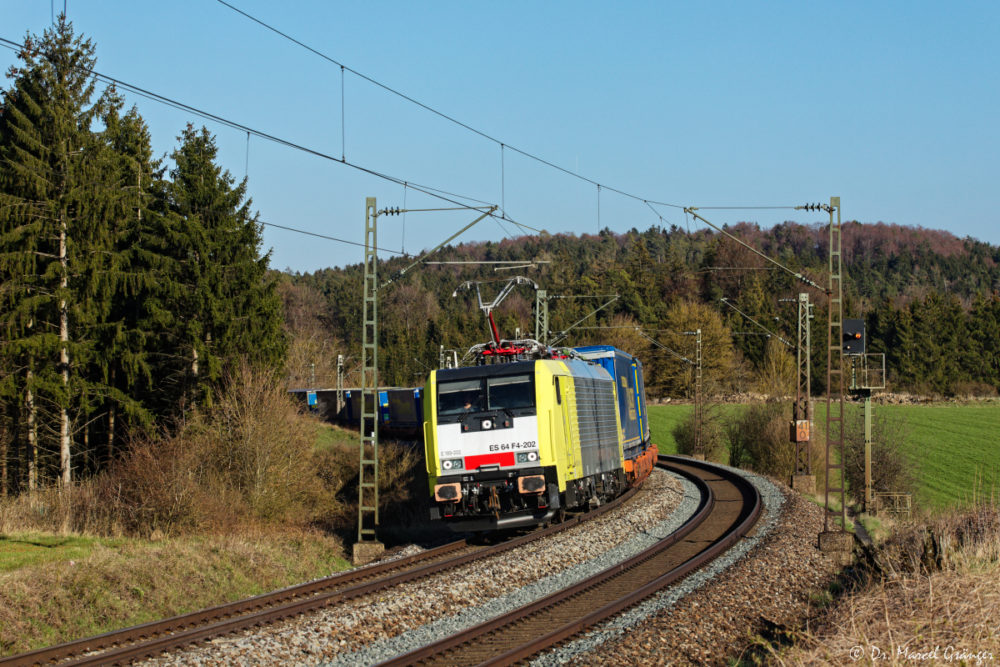 RTB-Cargo Vectron auf ebendiesem Damm mit Güterzug gen Nürnberg, gefolgt von…