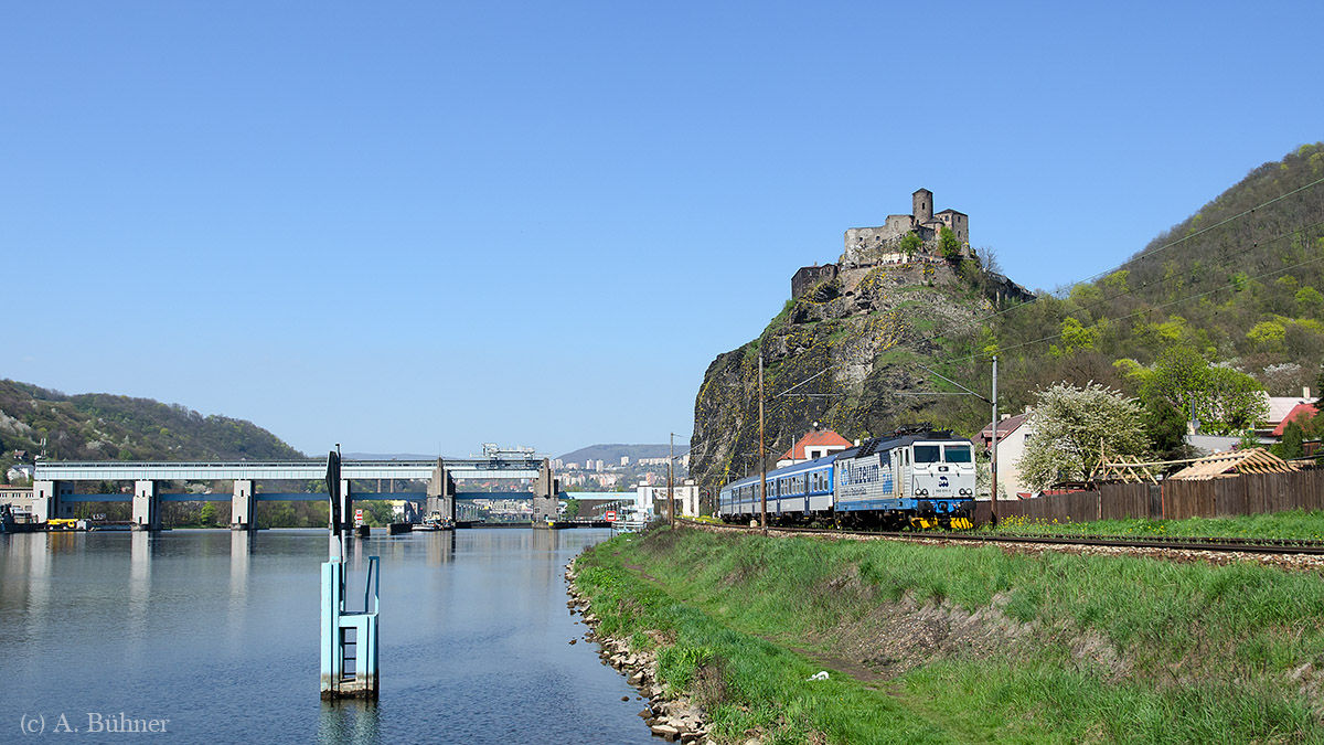 Nach einer Durststrecke von über einer Stunde begann es dann unterhalb der Burg Střekov (deutsch Schreckenstein) endlich wieder zu rollen. Um 15.28 Uhr brachte 123 060 einen Containerzug und nur zehn Minuten später betraten 363 047 und 749 262 die Bühne.