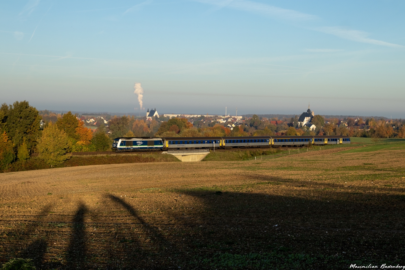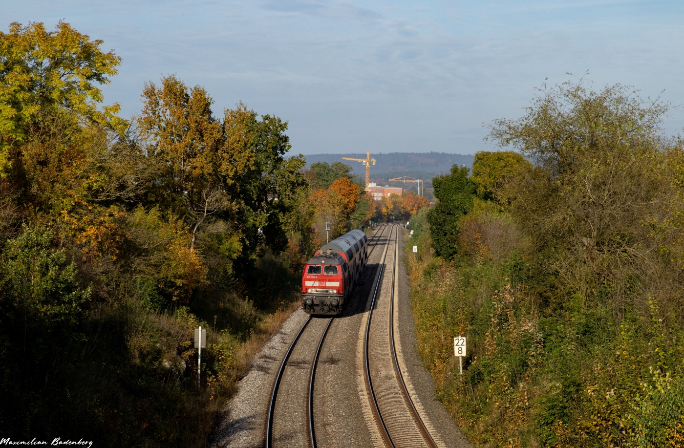 Auch am 21. Oktober zeigte sich die Sonne kurz, was für ein Bild von 218 498, welche Frisch aus Mühldorf wieder zum RE 2 gekommen war, genutzt.