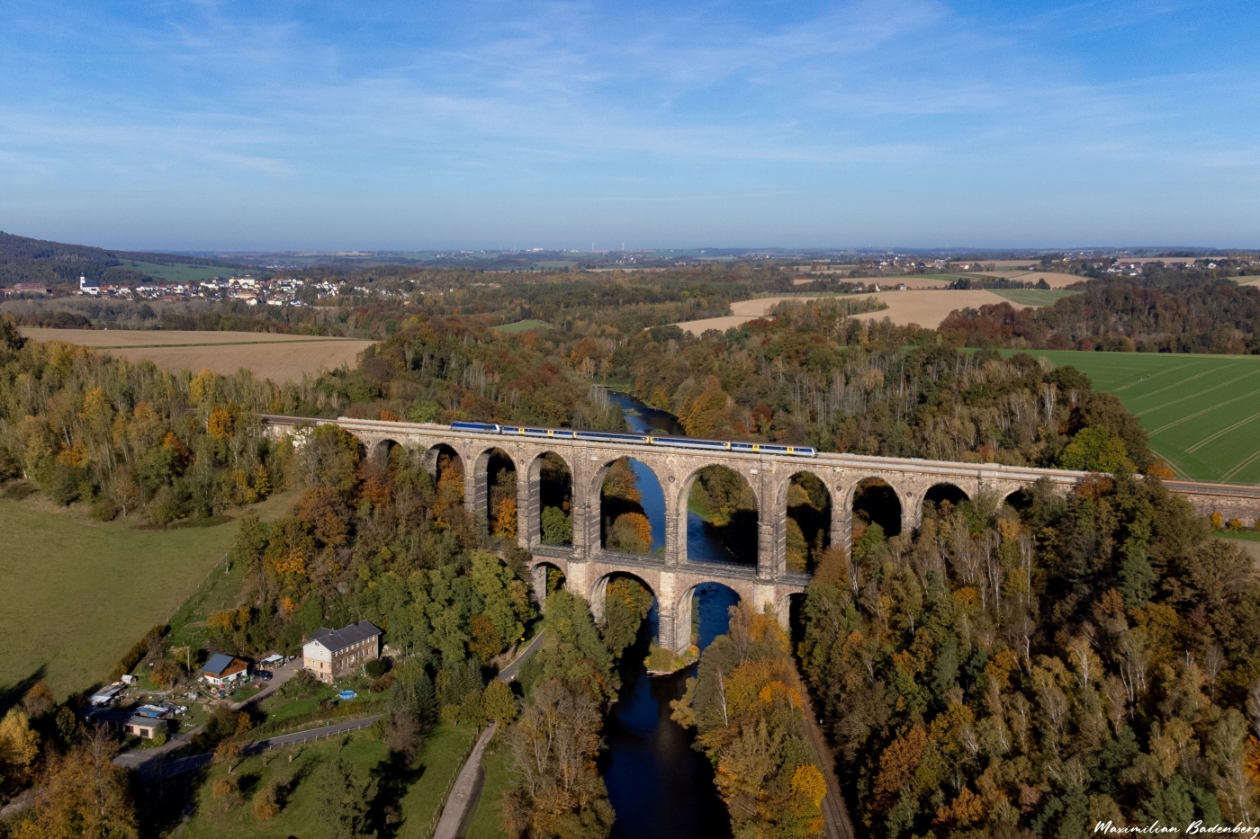 Das beeindruckendste Bauwerk entlang der Strecke dürfte das Göhren-Viadukt sein. Mit der Drohne ließ sich ein RE auf der Brücke aufnehmen.