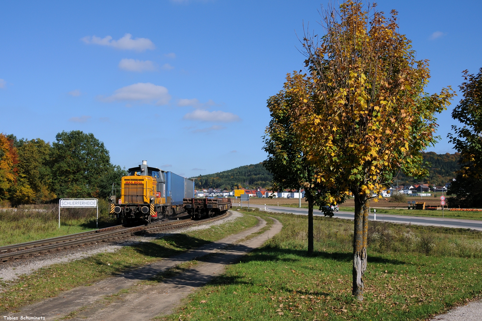 Denn ich musste weiter zum Reststück der ehemaligen Nebenbahn Neumarkt – Beilngries. Dort hatte ich die Info, dass die V60 608 von Max Bögl nochmals vor dem samstäglichen Tchibo-Zug zum Einsatz kommen sollte. Bei der Seitzermühle drückt die kleine Lok den langen Zug in Richtung Neumarkt.