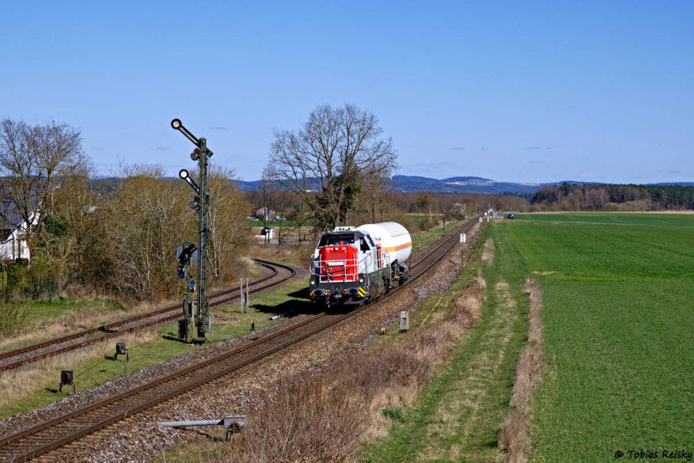 - Los ging’s am 6. April, als die Übergabe nach Freihöls auf dem Programm stand. Mit dem einen Gaswagen war die DE18 am Einfahrsignal des Zielbahnhofs aber sicher nicht überfordert. Links sieht man den Anschluß des Gashändlers Tyczka.