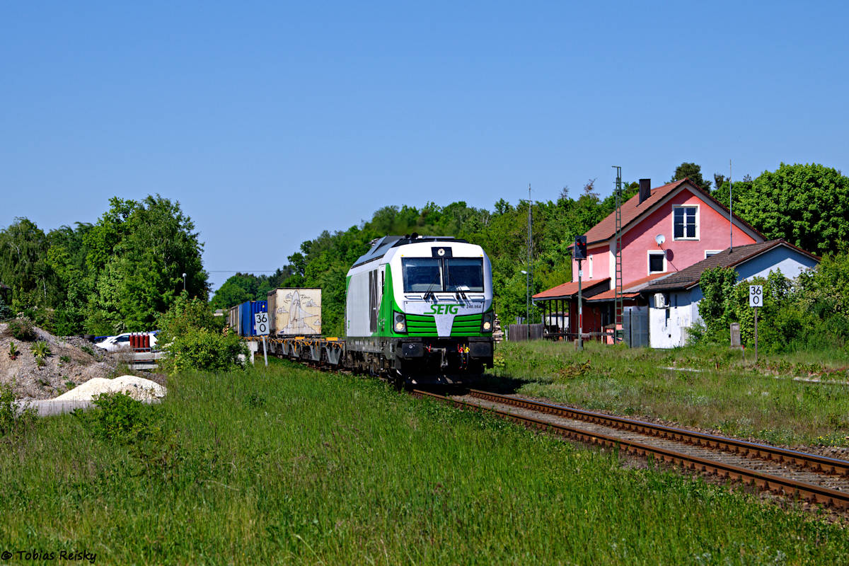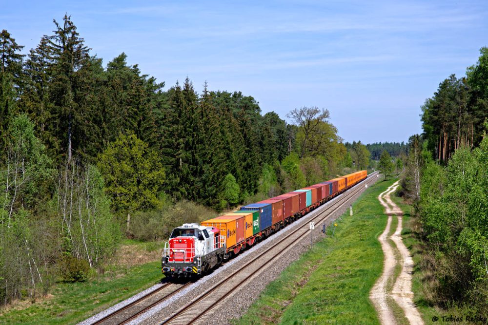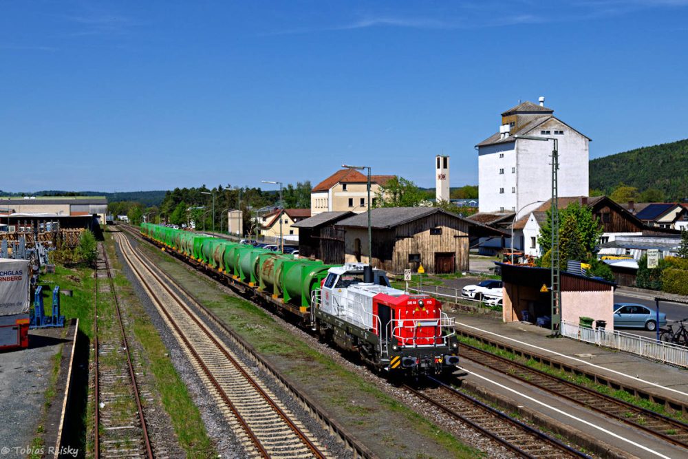 - Auch im Containerverkehr von und nach Altenschwand haben sich mittlerweile die DE18 etabliert. Zwischen Klardorf und Maxhütte-Haidhof war am 28.04. ein solcher Zug Richtung Regensburg unterwegs.