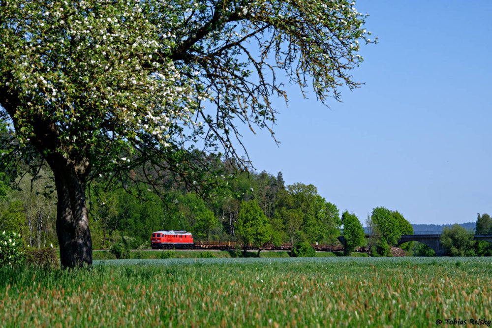 - Leider mit Flachwagen am Haken war am 02.05. 232 254 em blühenden Apfelbaum von Brensdorf unterwegs.