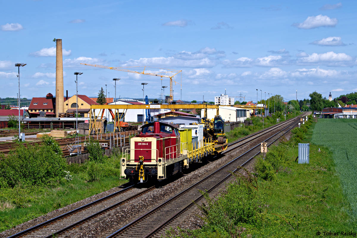 - Die interessant lackierte 295 004 von Railsystems beförderte am 11.05. einen kurzen Bauzug am Schwandorfer Schwellenwerk vorbei nach Landshut.