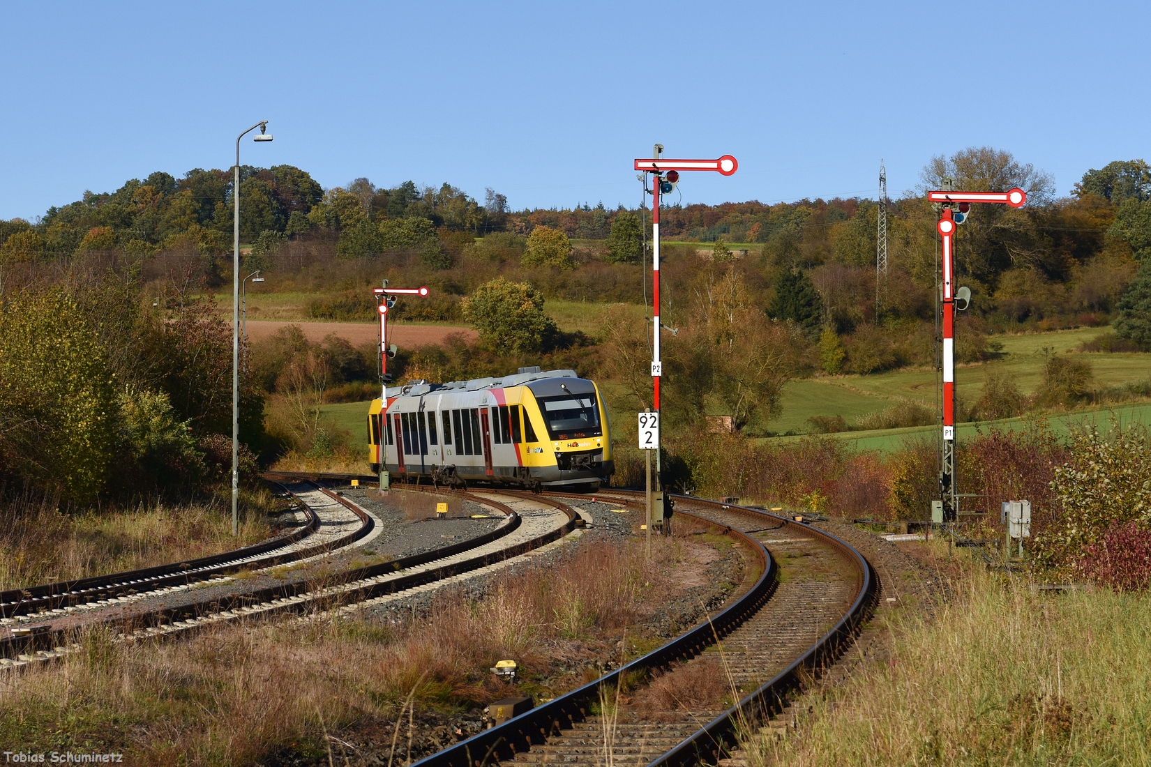 Schon lange wollte ich mal an der Vogelsbergbahn Gießen – Fulda „gscheite“ Bilder machen. Am Wochenende Ende der Kalenderwoche 42 war es dann soweit. Ein Treffen mit ein paar guten Freunden und Kollegen in Bad Salzschlirf stand an, da wo man sich 2011 während des Besuchs der Akademie für Personenstandswesen, welche bundesweit für die Aus- und Fortbildung für Standesbeamte zuständig ist, kennengelernt hat. Eine lustige komplett durchgemischte Gruppe, in welcher Spaß und Freude garantiert ist. Während des Wochenendes hatte ich viel erlebt und die Freude war groß, am Sonntagvormittag fiel der Abschied wie immer schwer, aber ich wollte heute etwas eher los, denn die Wettervorhersage war gut. In Bad Salzschlirf war Nebel, ich hoffte aber dass im Bereich Großenlüder schon die Sonne war, die Wetterradare konnten das nicht 100%ig genau anzeigen. In Großenlüder angekommen, war noch dichter Nebel, das Bild spare ich euch aber. Anschließend für den nächsten Zug weiter nach Bimbach gefahren, auch da Nebel, das war nun blöd, aber für den nächsten Zug sollte es dann reichen.