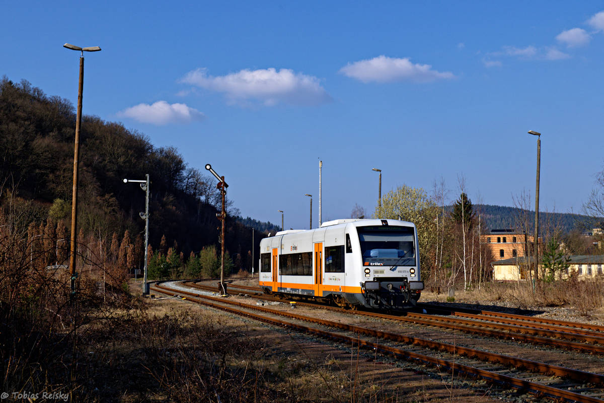 - Als einer von nur zwei im trilex-Design gehaltene Shuttles zeigt sich hier 650 073 beim Verlassen des Bahnhofs Greiz Richtung Weischlitz.