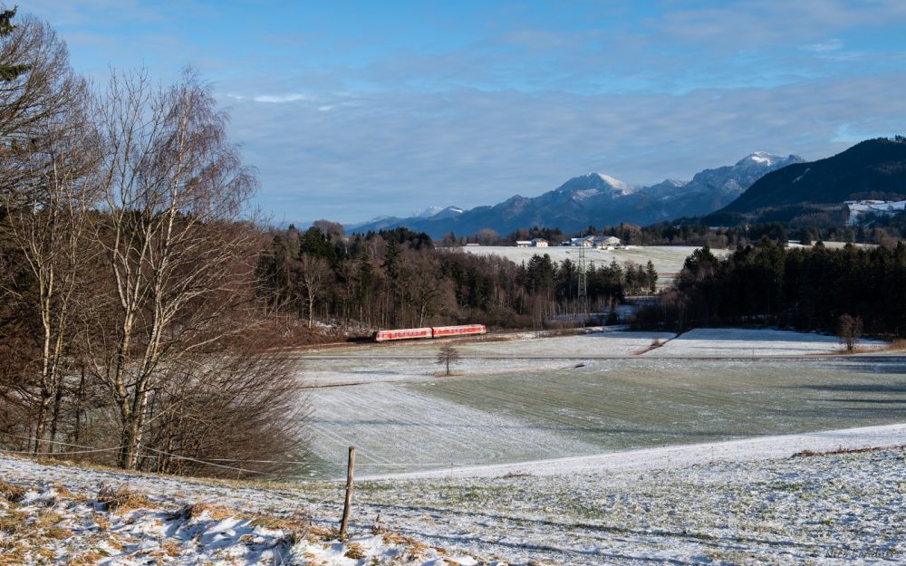 - Nachdem die Fahrt nach Aschau wegen eines Wolkenschadens leider nicht fotografiert werden konnte, klappte die Rückfahrt dafür umso besser. Von einer Anhöhe bei Umratshausen hat man einen tollen Blick auf Bahn und Berge.