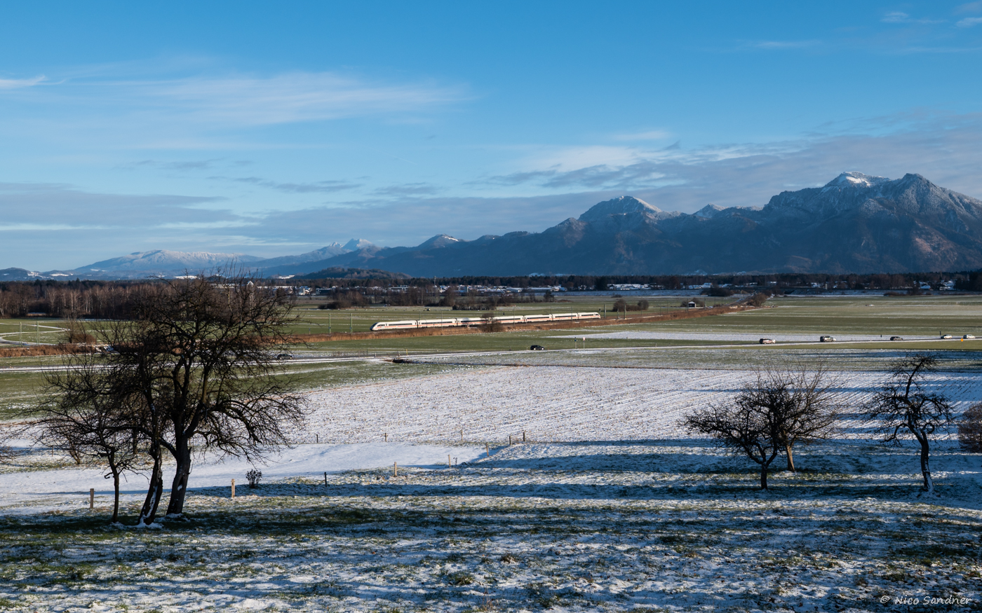 - Nachdem die Fahrt nach Aschau wegen eines Wolkenschadens leider nicht fotografiert werden konnte, klappte die Rückfahrt dafür umso besser. Von einer Anhöhe bei Umratshausen hat man einen tollen Blick auf Bahn und Berge.