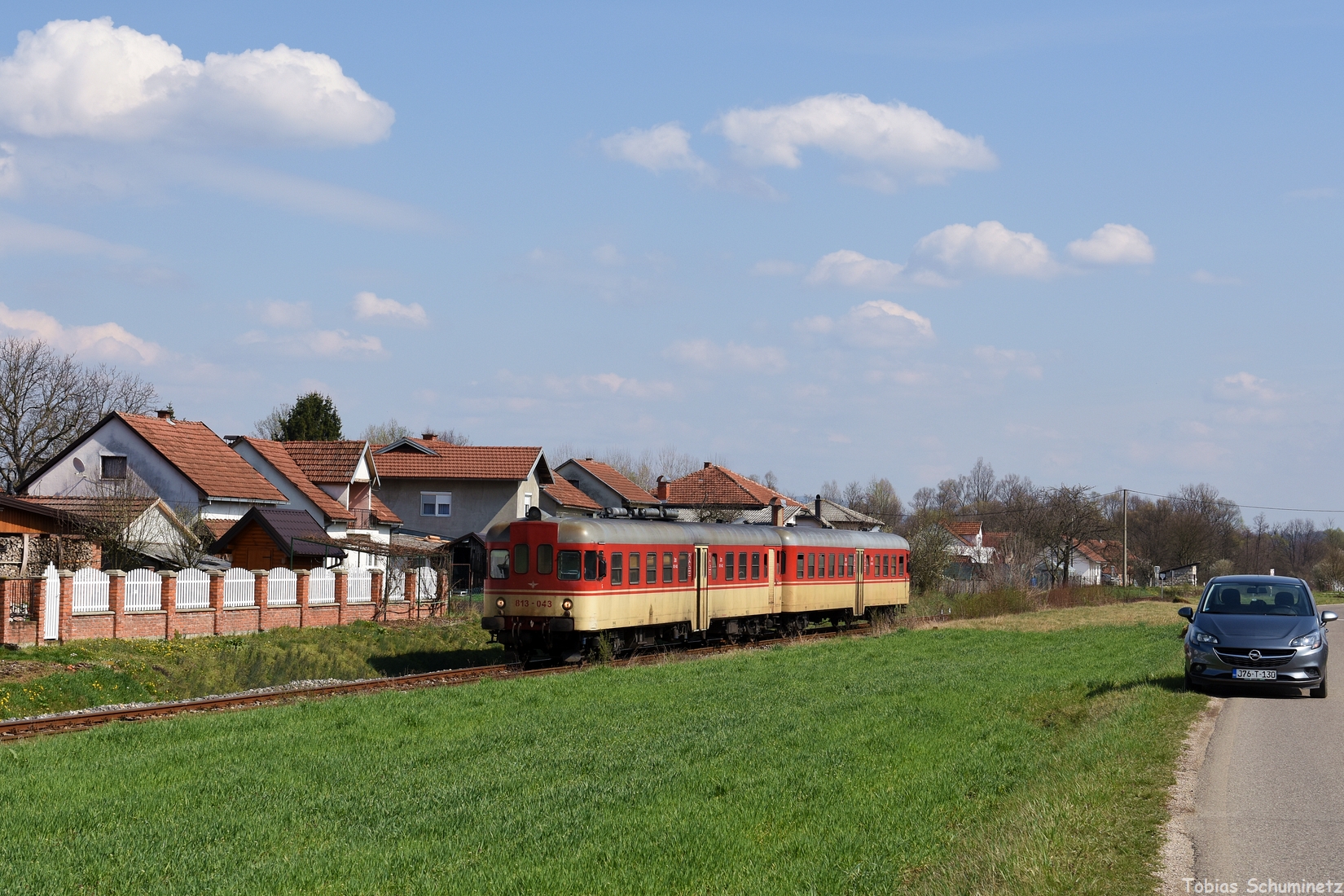 Da der Zug nur gut 10 Minuten in Petrovo Novo stehen sollte suchten wir uns gleich direkt ein Motiv für die Rückfahrt. Zwischen Karanovac und Boljanic wurden wir für diesen Seitenschuss fündig. Nun führt 813-043.