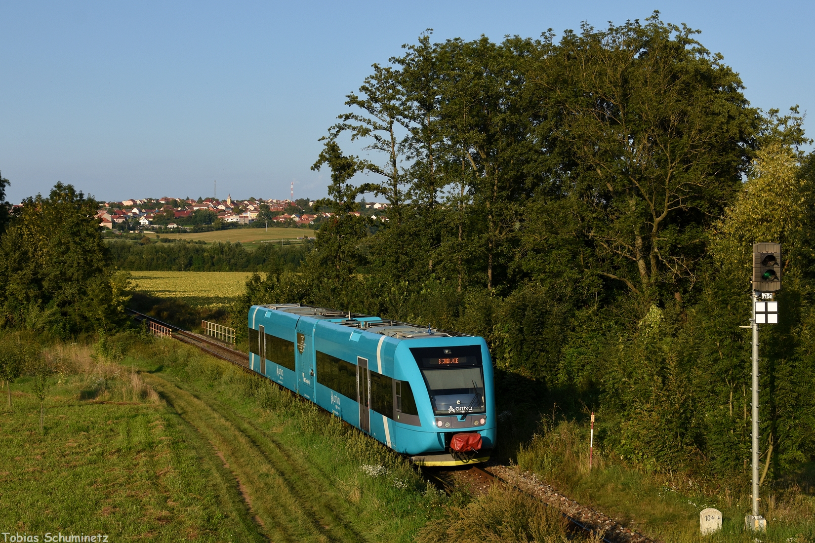Ab und an verirrt sich auch ein Arriva-GTW auf die Strecke. Beim Blick auf Popovice bei Vesky musste leider dieser Nachschuss herhalten, da wir den entgegenkommenden Triebwagen etwas versemmelt haben.