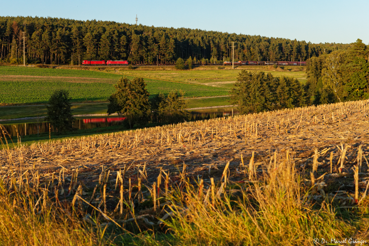 Einen etwas anderen Blickwinkel fand ich für den einige Zeit später folgenden gemischten Güterzug, welcher sich hier leider recht wenig abhebt. Diese Motivvariante muss also noch einmal wiederholt werden – in der Hoffnung, dass dann ein bunt leuchtender Containerzug des Weges kommt. 😉 Danach war dann „Licht aus“ und es ging weiter nach Hause.