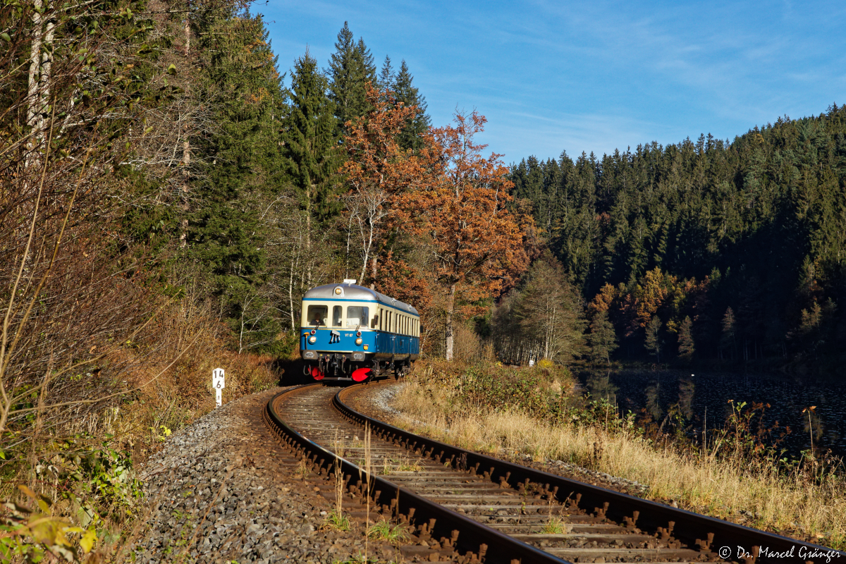 Ein Wochenende war der VT07 der Länderbahn auf großer Fahrt unterwegs. Hier noch zu Beginn der Reise auf „heimischer“ Schienenstrecke bei Gumpenried-Asbach.