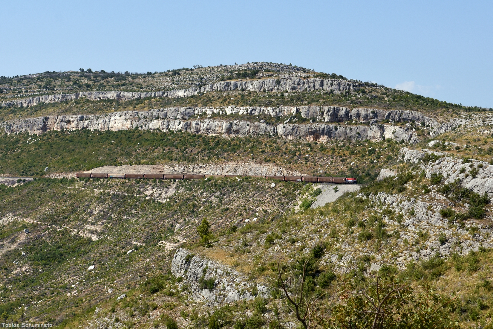 Wir wollten die Verfolgung aufnehmen, kurz vor Benkovac gibt es eine kleine Brücke das müsste man schaffen. Aber dummerweise war genau im Bereich Zadar auf der Autobahn unendlich viel Verkehr und es staute sich teilweise massiv von den Mautstellen auf die Autobahn zurück. Wir wollten in Benkovac rausfahren, Google-Maps zeigt normalerweise zuverlässig den Verkehr an, aber irgendwie funktionierte es grad nicht richtig sodass wir dann in einem diese „Mautstaus“ steckten. Es waren aber hier nur etwa 8 Fahrzeuge vor uns. Wir dachten dass der Zug schon längst durch ist und sind gleich weiter gefahren. Dann kam aber von den Kollegen die Info, dass der Zug noch nicht soweit ist. Also nochmals umgedreht, doch dann kam er uns bereits entgegen und wir schlachteten ihn am einem Bahnübergang Not, das war nichts. Mir fiel dann nur noch die Felskante bei Devrske ein, welche wir dann ansteuerten.