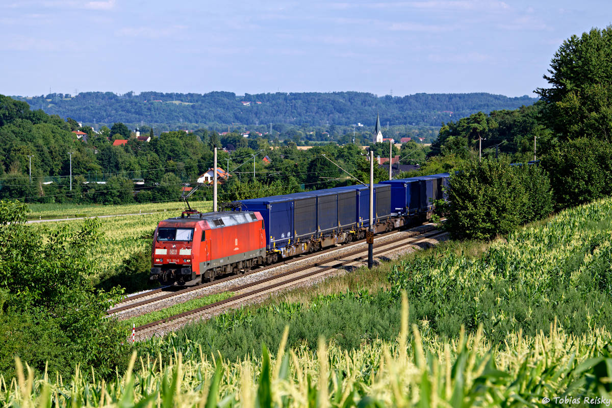 - Sprung nach Süden: In der Nähe der neuen Üst Artlkofen hatte ich einen Blick ausgemacht, den ich unbedingt mal ausprobieren wollte. Zufällig kam dann osgar einer der raren Güterzüge auf dieser Strecke vorbei.