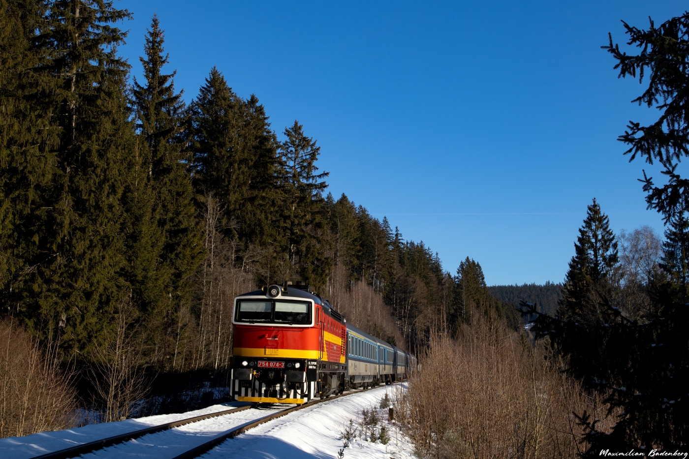 Zum Auftakt des sonnigen Tages, fuhr ich zunächst über die Grenze nach Špičák. Mit dem R 776 war 754 074 auf dem Weg nach Eisenstein.