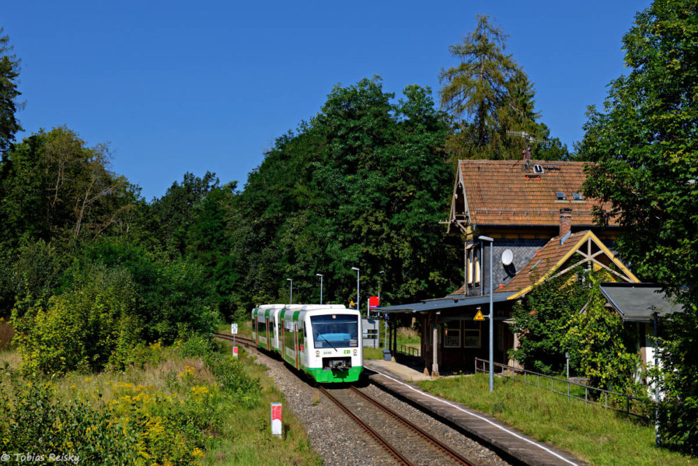 - Die Bahnhöfe an der Strecke sind zwar alle modernisiert, dennoch lassen sich noch ein paar schöne Blicke finden: Mellenbach-Glasbach.