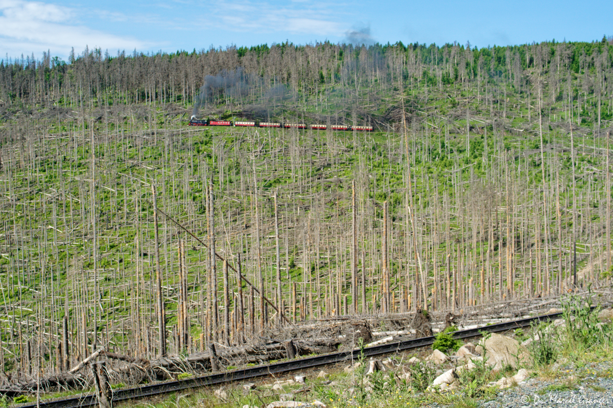 Auch eine Wanderung zum Brocken stand auf dem Programm. Erschreckend einerseits, wie im Bereich des Eckerlochs der Borkenkäfer zugeschlagen hat. Ermutigend aber auf den zweiten Blick: Der junge (und künftig hoffentlich dem Klimawandel trotzende) Wald wächst schon kräftig nach. Hier kämpft sich am 16.06.2022 jedenfalls ein Zug hinauf zum Brocken.