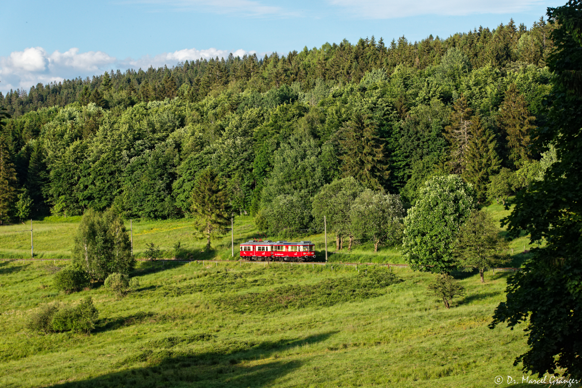 Nochmal Blick auf die Einfahrt des Bahnhofs Cursdorf – nun aus kräftig duftenden Bergwiesen aufgenommen.