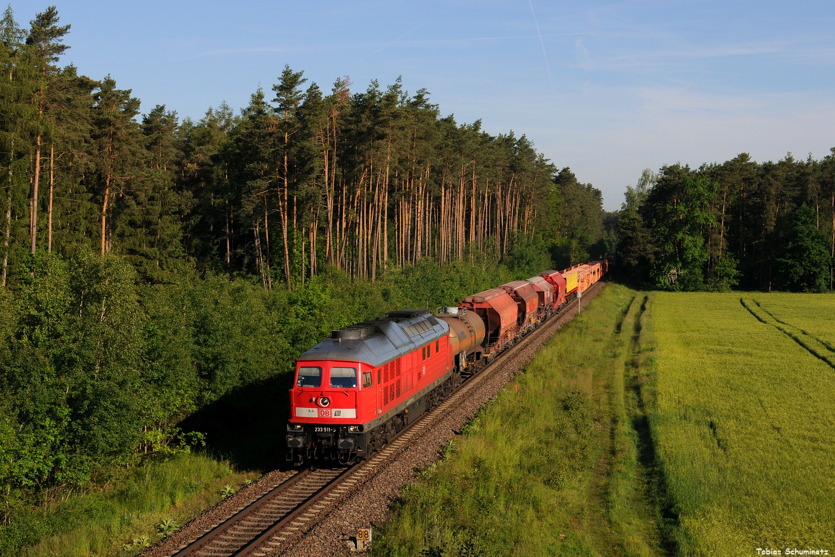 Am Sonntag, den 02.06.2019, habe ich leider verschlafen… Ich wollte den EZ51716 eigentlich schon früher aufnehmen, doch ich schaffte es nur noch bis kurz vor Irrenlohe. 233 511 kommt hier gerade aus den Wäldern zwischen Freihöls und Irrenlohe.