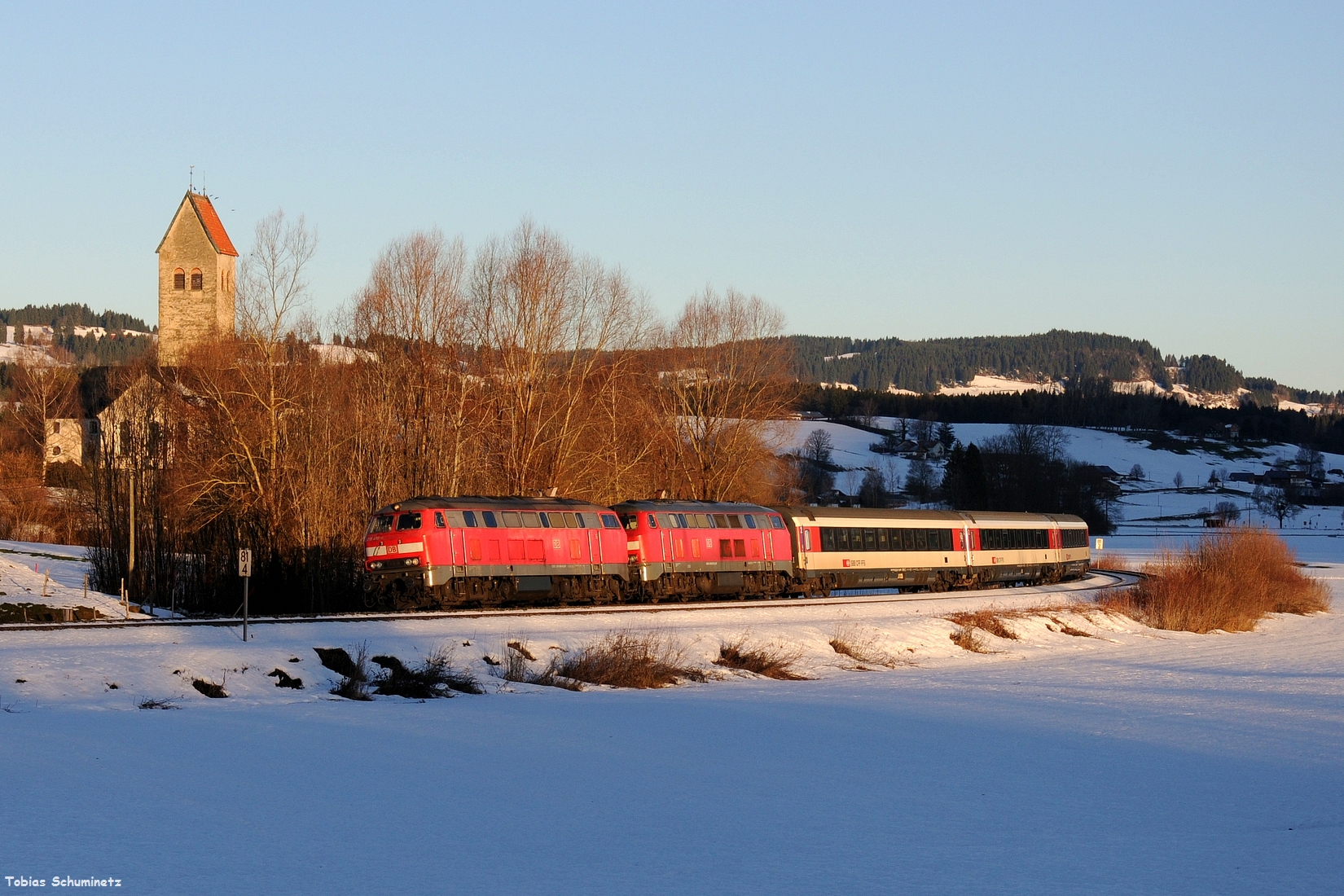 Nur kurze Zeit später folgte der IC2012, welcher bei Unterthalhofen von 218 343 und 218 434 gezogen wurde und mit Blick auf die Kirche von Fischen umgesetzt wurde.